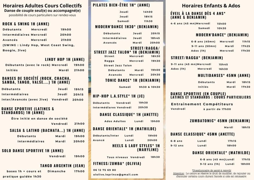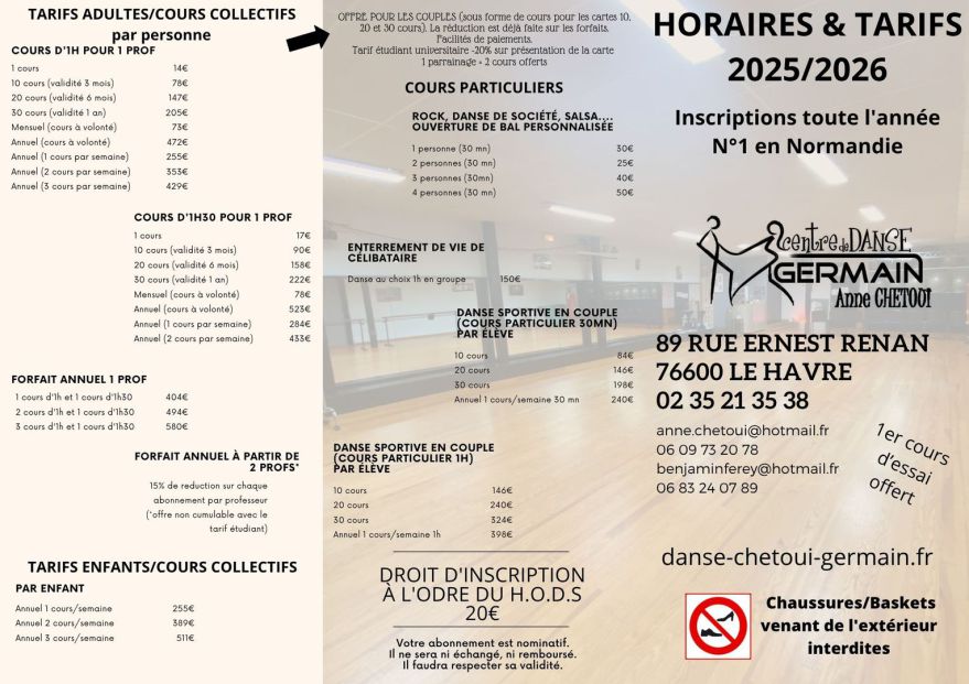 Vous recherchez une activité corporelle en couple ou individuelle, un moment de détente, une séance de remise en forme ou d’assouplissement. Avec quarante années d’existence, le Centre de Danse Germain- Anne Chetoui sait renouveler cours et stages, techniques et chorégraphies en fonction des attentes de chacun.